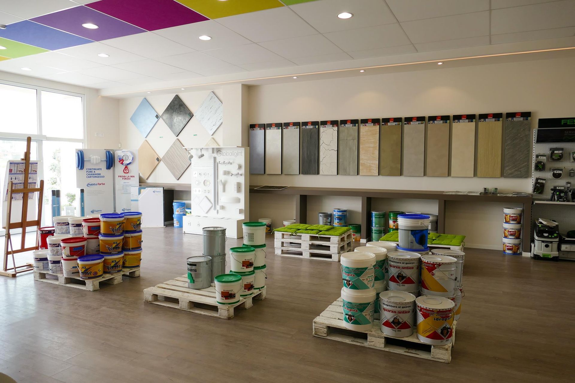 Oltre alle pitture murali, l’offerta comprende una selezione completa di smalti, fondi e prodotti tecnici. Questi materiali sono fondamentali per preparare le superfici e migliorare la resa finale delle finiture.